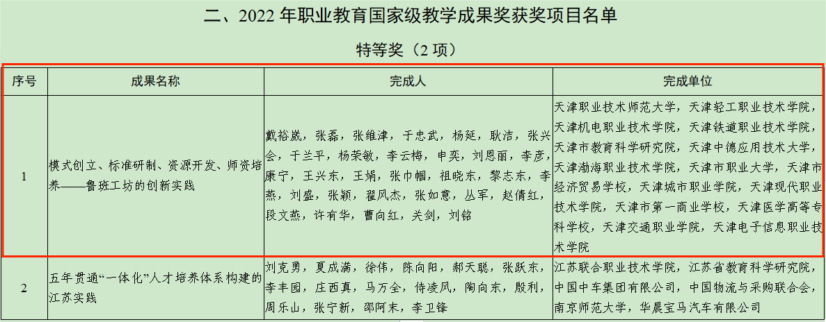原网讯【通信员 李硕】即日,《教导部对于同意2022年邦家级教授结果奖获奖名目的决意》颁发,经邦家级教育结果奖评审委员会评审决定,由天津劳动技能师范年夜教为第1达成单元申诉的效果《形式树立、规范研造、资本开辟、师资培育种植提拔——鲁班工坊的更始理论》枯获2022年邦家级传授结果非凡奖。