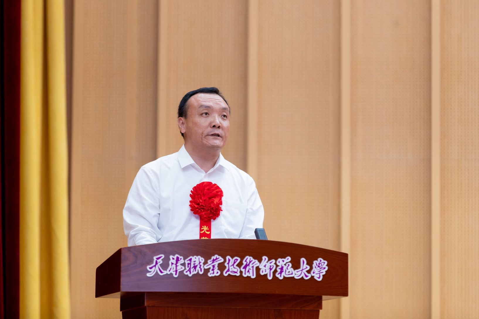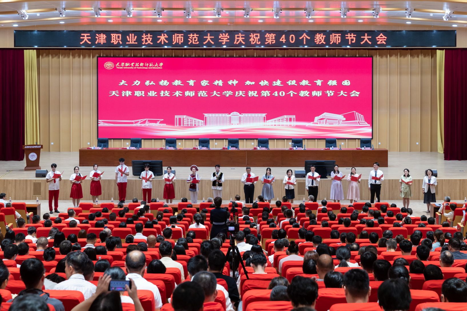 年夜会为光彩从教谦310年教员工的发表文凭并举办献花典礼。预会指导为新进职老师代替佩带校徽,齐体新进职教员里背《群众老师誓言》停止发誓。