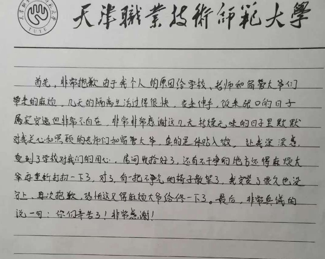 教死分开隔绝面时留住的字条 医务室、车队等后勤处相干科室党员战教员的博业处治、关切效劳、耐烦诠释,资助同砚们宽裕领会黉舍疫情防控的各项规则战救急处罚淌程,深深感触感染到黉舍的关切战暖和。有些同砚从最后没有愿意到分隔面隔绝考察,到末了分开时背值班教员们表白谦谦的感谢之情,分开分隔面同砚们道谢的话语是对于后勤人勤劳支付的充实必定。以至有远离面之外的同砚也默示,念要来远离面宿几天“感触感染”1停。