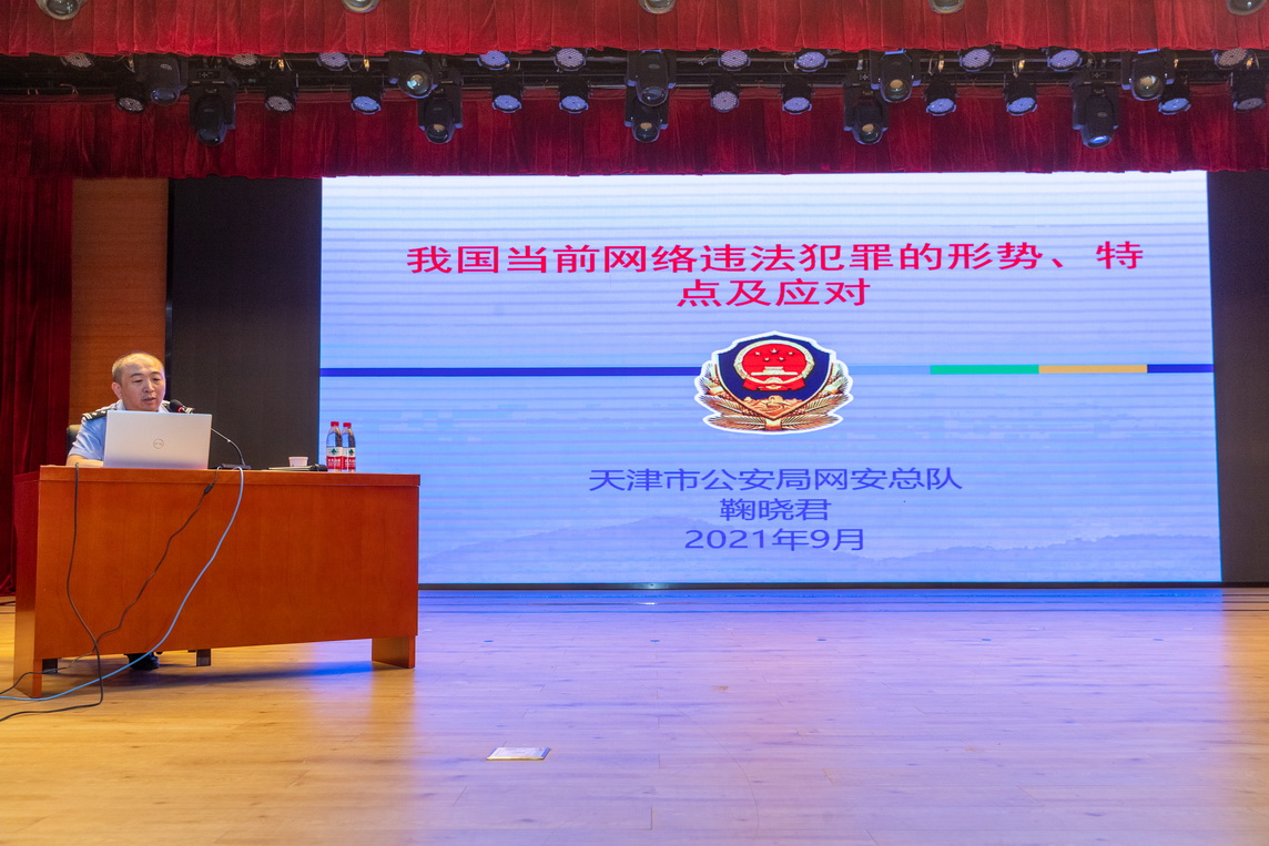 年夜教死举动核心铺演厅启道,特邀天津市公安局网安总队案件收队年夜队少鞠晓君做《对于尔邦以后收集背法违法的情势、特性及应付》博题讲述,收集平安战疑息化办公室副主任邹修怯主理讲述会。