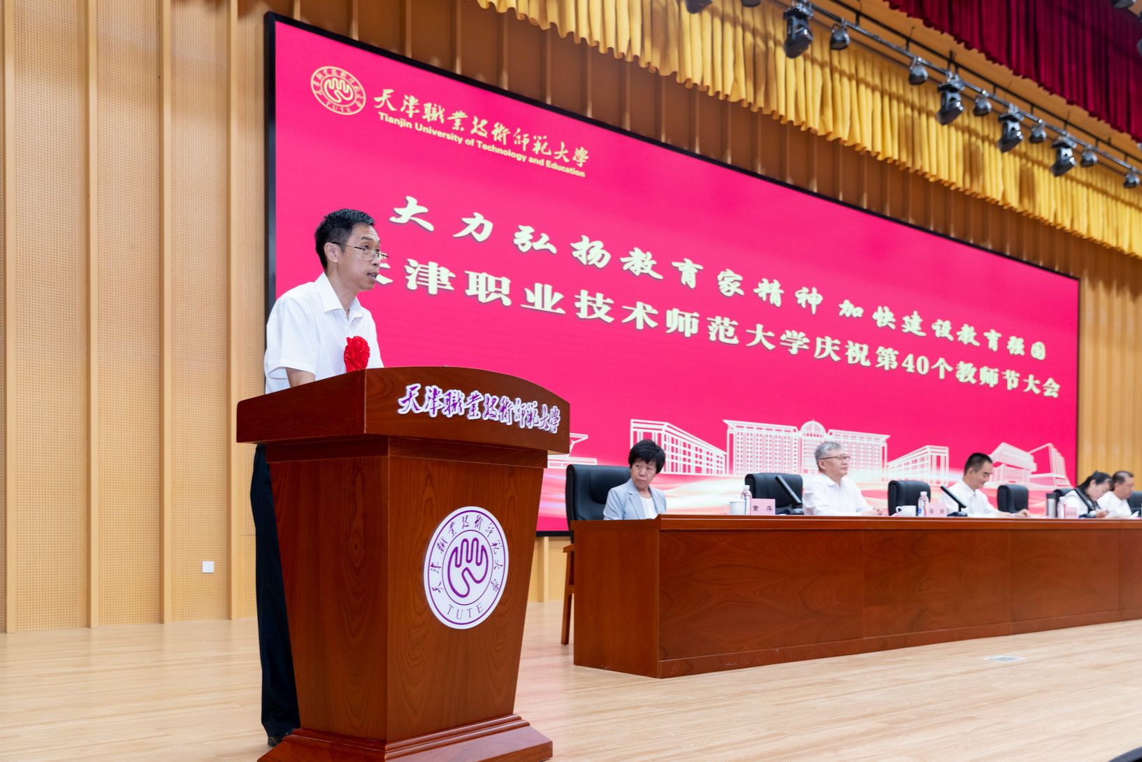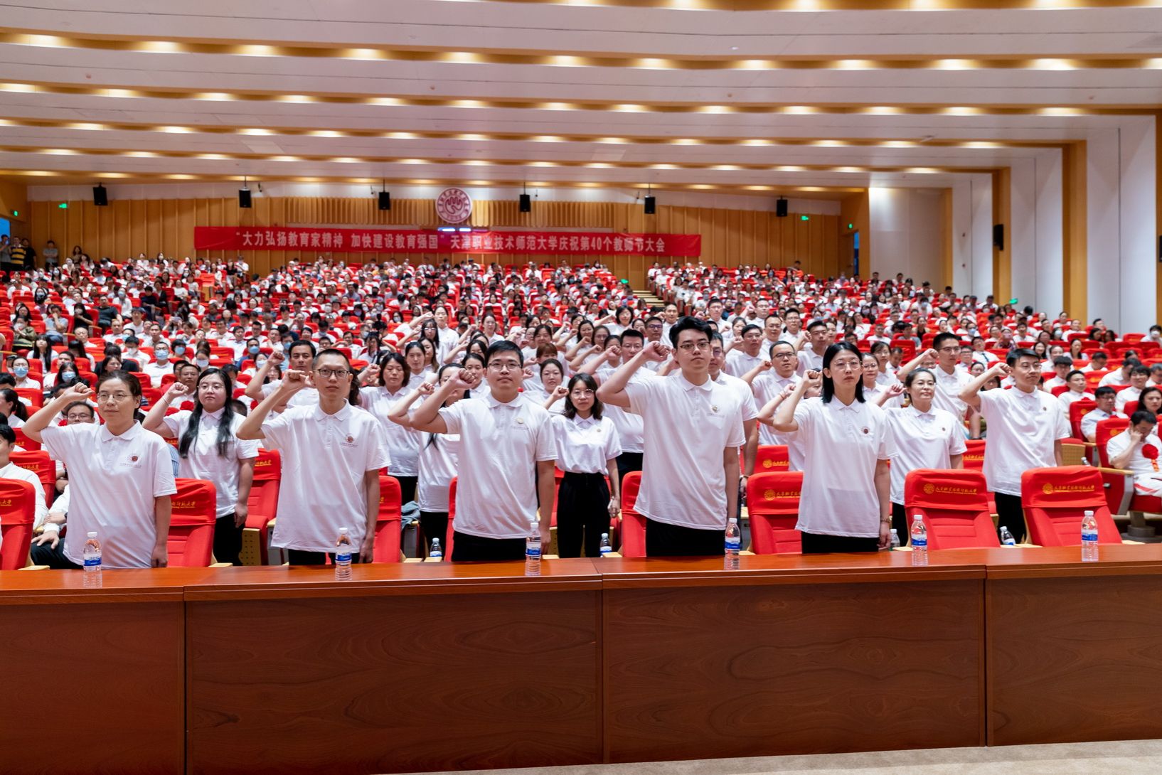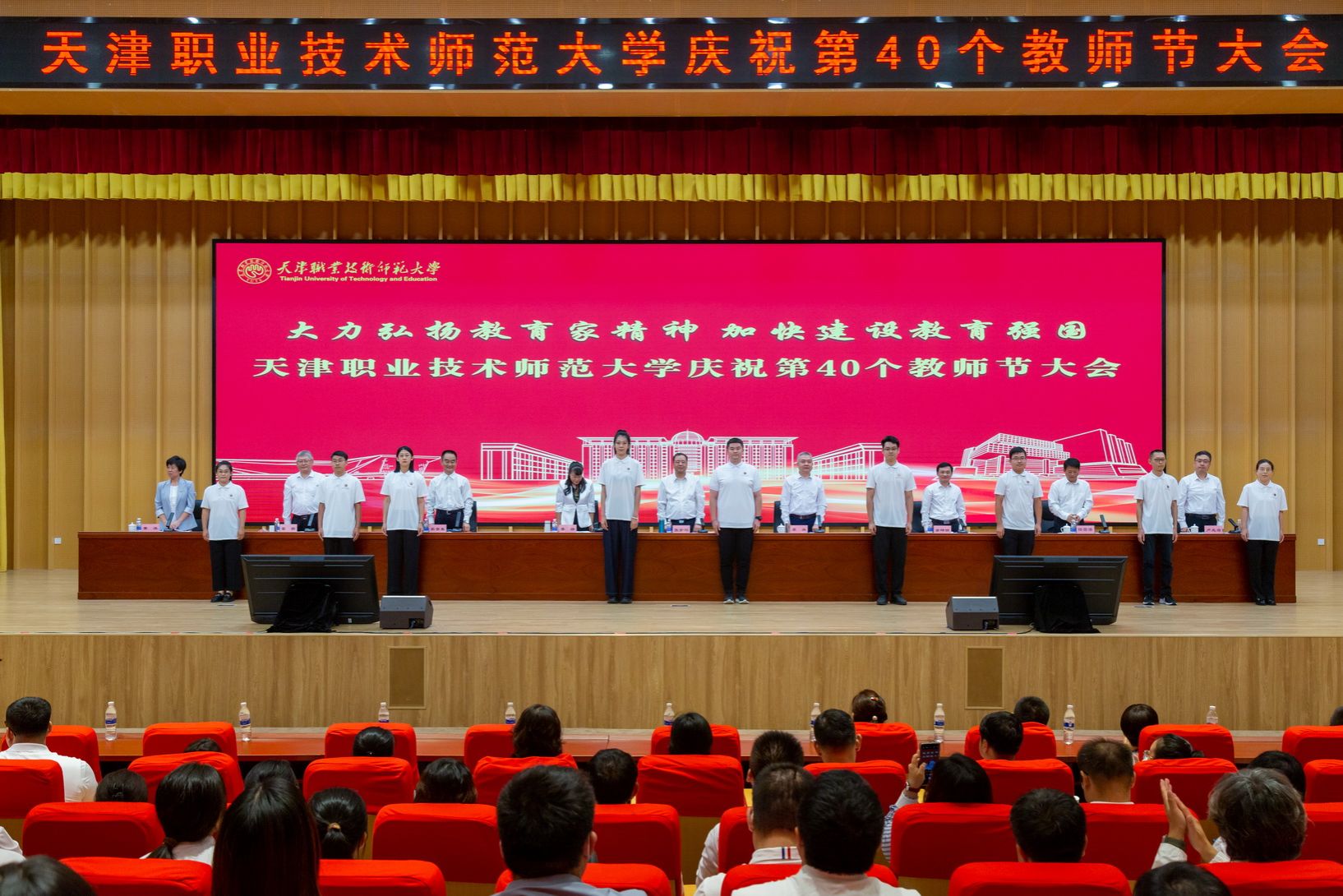 年夜会为光彩从教谦310年教员工的发表文凭并举办献花典礼。预会指导为新进职老师代替佩带校徽,齐体新进职教员里背《群众老师誓言》停止发誓。